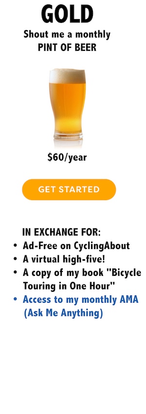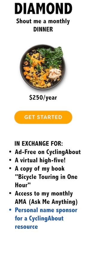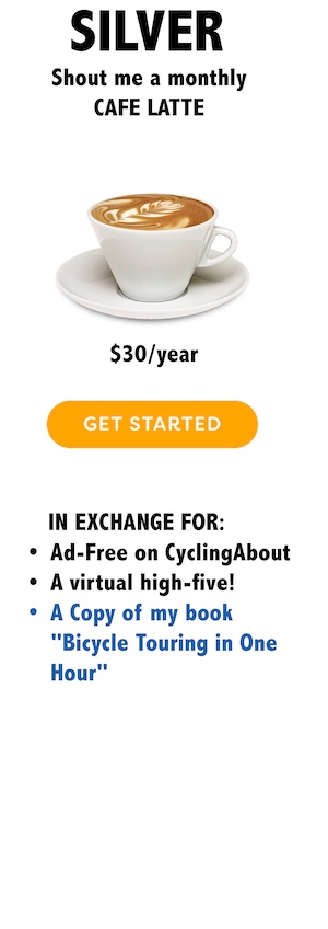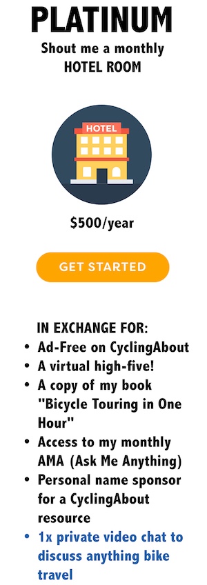 Article sponsorship allows site supporters to optionally be acknowledged at the start of the article for making the work possible. The support level, Platinum or Diamond – reflects the approximate time, resources, and research that goes into a single piece on CyclingAbout.com. The top level of support permits a one-hour video conversation with me. I’m happy to advise on anything related to buying bikes or gear, destinations or ways of best-conducting your trips. Or perhaps you’d like to simply compare travel experiences or discuss your ideas for other content on the website.